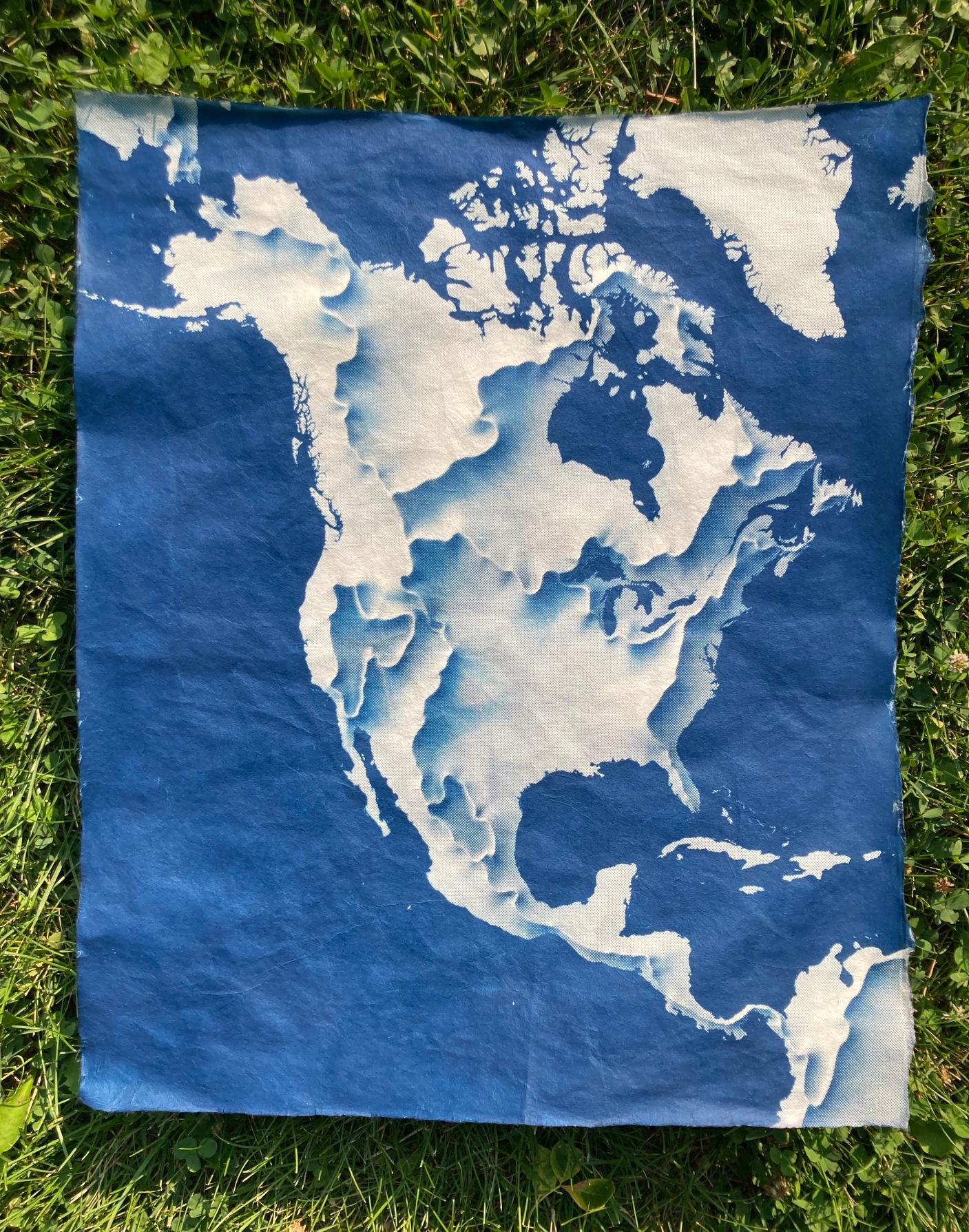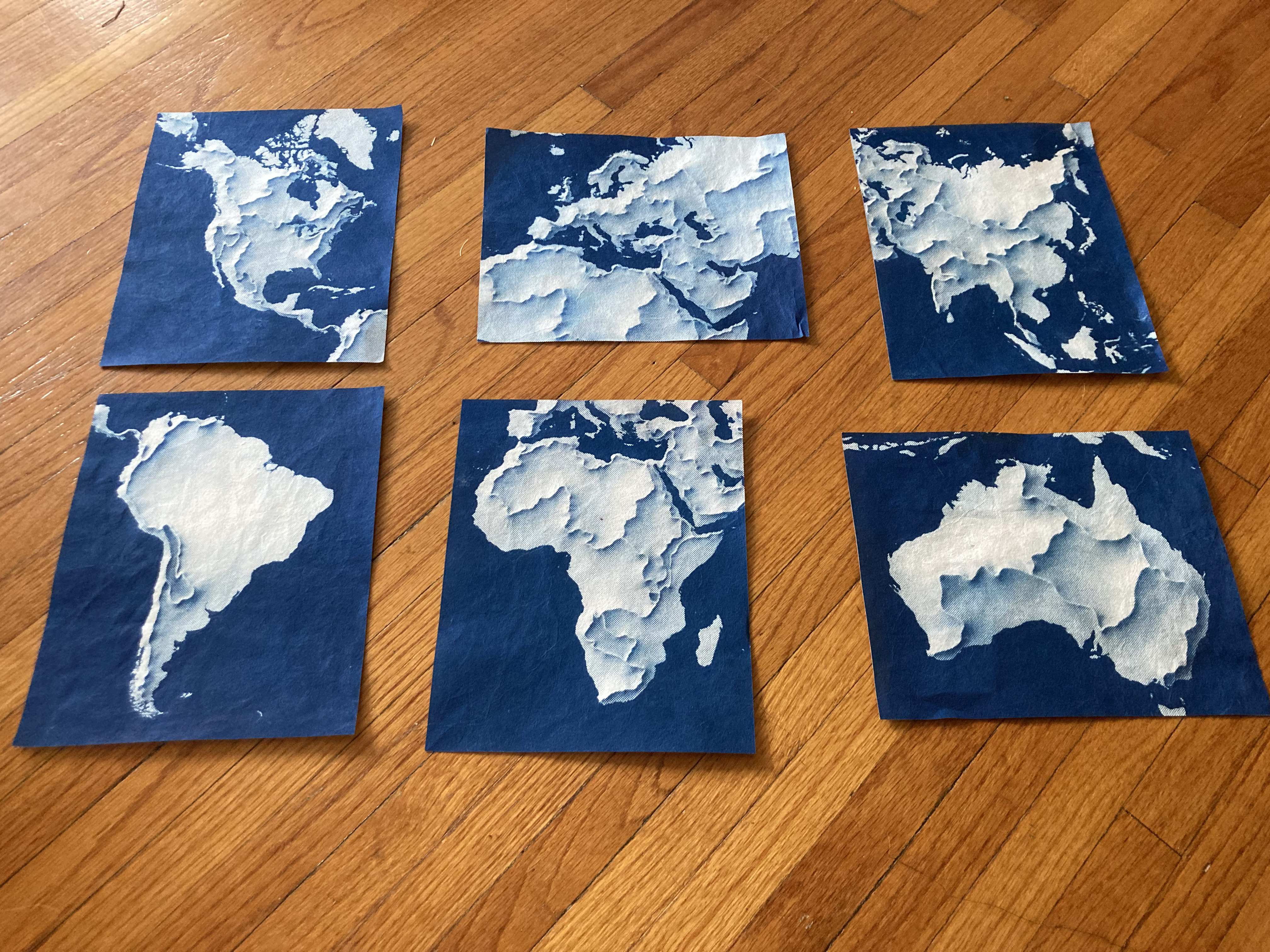 Hand-printed PostersThis poster series depicts the major drainage divides of the continents, and is manually printed on handmade Japanese paper, using sunlight and the cyanotype process. Each print is unique, with its own individual character.